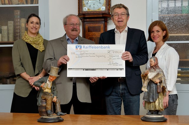Museumsdirektor Dr. Peter Germann-Bauer (Mitte) freute sich zusammen mit den Ausstellungskuratorinnen Karin Geiger M. A. (links) und Sabine Tausch M. A. über die Spende von Euro 5000, die der 1.Vorsitzende des Geschichts-und Kulturvereins Regensburg.-Kumpfmühl e. V. (GKVR) Hubert H. Wartner als finanzielle Unterstützung für die Begleitpublikation zur Ausstellung übergeben konnte; den großzügigen Betrag hatte Franz Zambelli, der Seniorchef der Zambelli Gruppe, Grafenau, zur Verfügung gestellt. Die Fa. Zambelli hatte in den neunziger Jahren des vorigen Jahrhunderts bei der umfangreichen Renovierung des von Maison gestalteten Fama-Brunnens vor Schloss Herrenchiemsee mitgewirkt. Im Bildvordergrund zwei „Münchner Typen“, prämierte Figuren Maisons, die unter anderem auch in der Ausstellung im Historischen Museum Regensburg zu sehen sein werden.